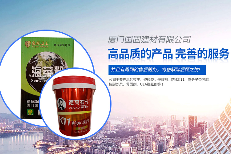 ??廈門國固建材有限公司是集科研開發,生產為一體的混凝土外加劑科技生產單位,公司技術力量雄厚,工藝科學先進,產品質量及性能在全國同行業中。并且有周到的售后服務,為您解除后顧之憂。本廠生產的產品,科技含量高,質量穩定,檢驗嚴格,其主要技術指標經福建建筑科學院嚴格鑒定測試后均達到國標標準。是目前水泥制品中理想的名加劑產品,適用道路、橋梁、工業與民用建筑,對鋼筋無繡蝕、具有良好的經濟及環保效益,是國家建筑學會積極推廣的外加劑產品。本廠推廣標準化,規范化、程序化管理、具有健全、完善、持續穩定運行的質量保證體系。產品遠銷上海、江蘇、浙江、廣州、北京、江西、安徽、福建等地,在大批國家建設工程中應用效果良好,并以性能優越、質量可靠、以及良好的售后服務在市場上享有很高的信譽。本廠在今后的歷程中,將一如既往的為您提供高質量、高科技的產品,完善的服務以感謝廣大客戶的支持和厚愛。“科技創新、以誠為本,用戶滿意”是我公司發展的永恒目標,我們堅持“以誠結情、質量取勝”,以高品質的產品回報社會。“用科興建材,創優品工程”,期待與各界朋友與時俱進,努力開拓進取,力求為用戶提供“高品質的產品,完善的服務”。公司愿與設計部門、建設單位、施工企業及同行們攜手合作,共創未來,共鑄輝煌、公司主要產品砂漿王、瓷磚膠,嵌縫劑、防水K11、高分子益膠泥、抗裂砂漿、界面劑、UEA膨脹劑等!